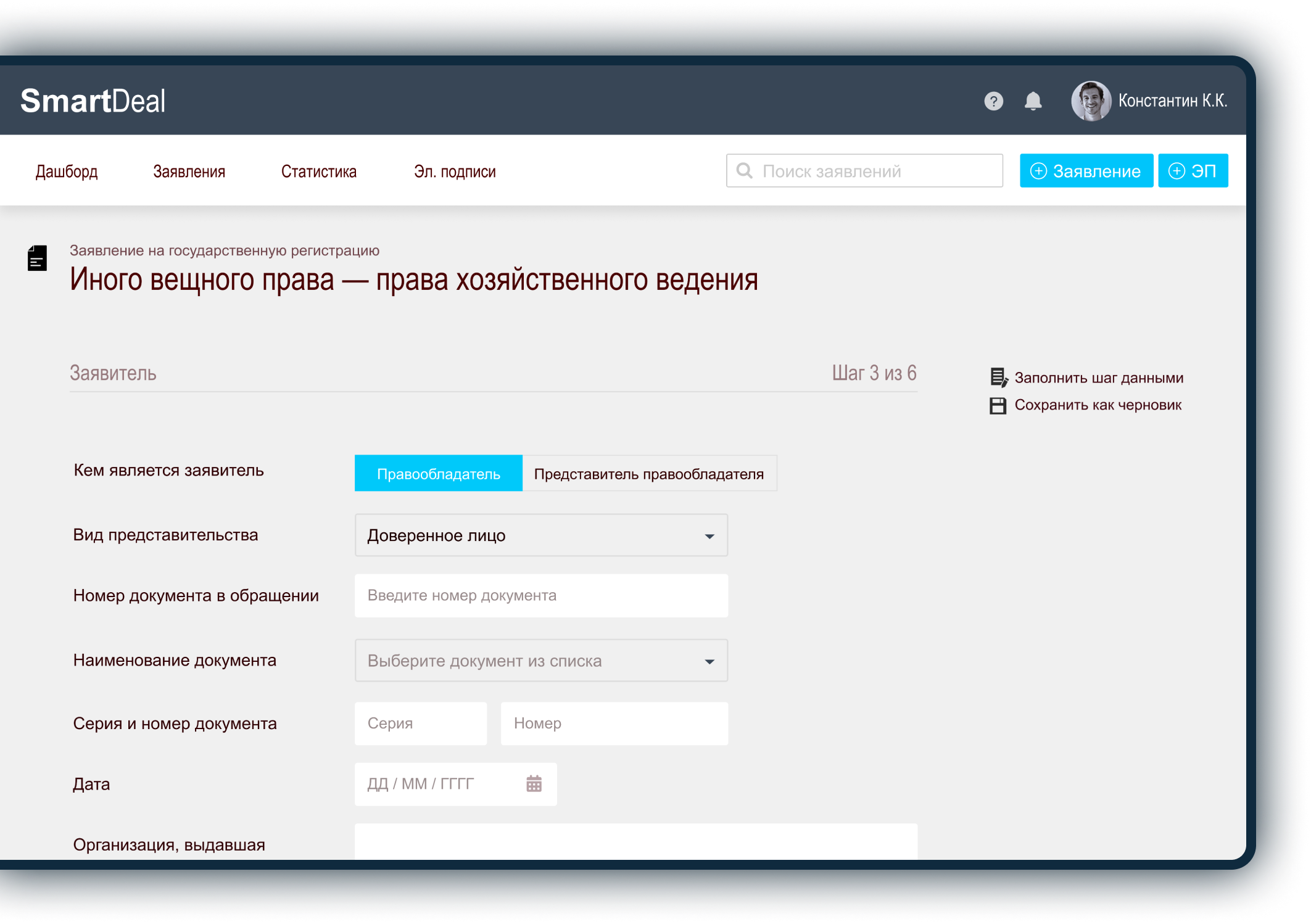 Мы разбили создание заявления на несколько шагов — в зависимости от типа заявления. Пользователь может переходить между этими шагами в любом порядке и заполнять только те поля, для которых данные уже есть.