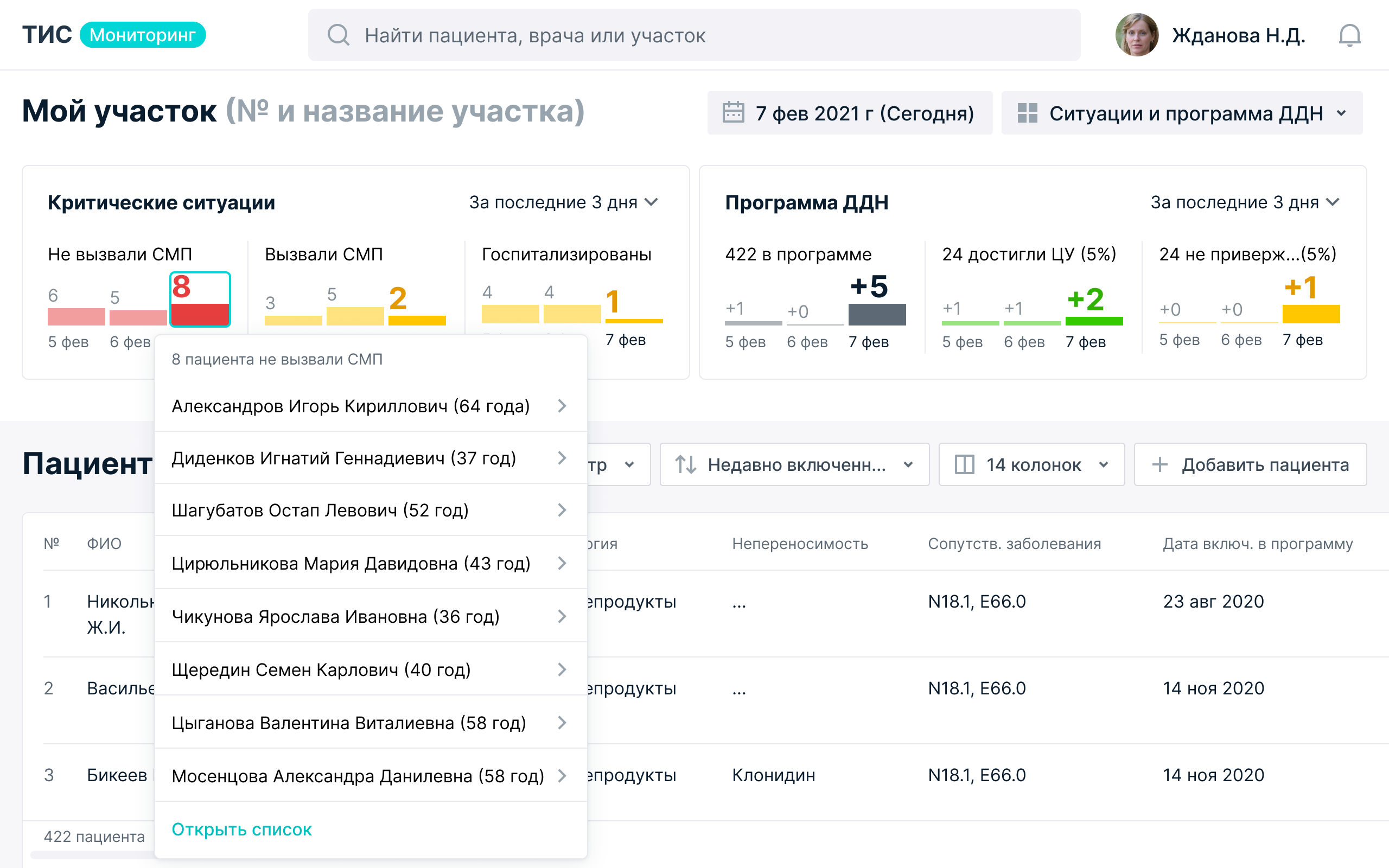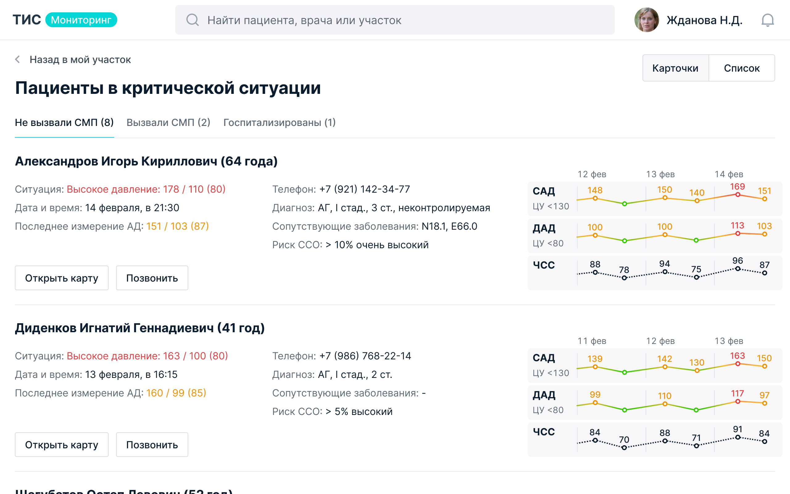 Он отобразит всех пациентов врача с указанием уровня сердечно-сосудистого риска. Позволит вовремя изменить терапию, в критической ситуации – госпитализировать.