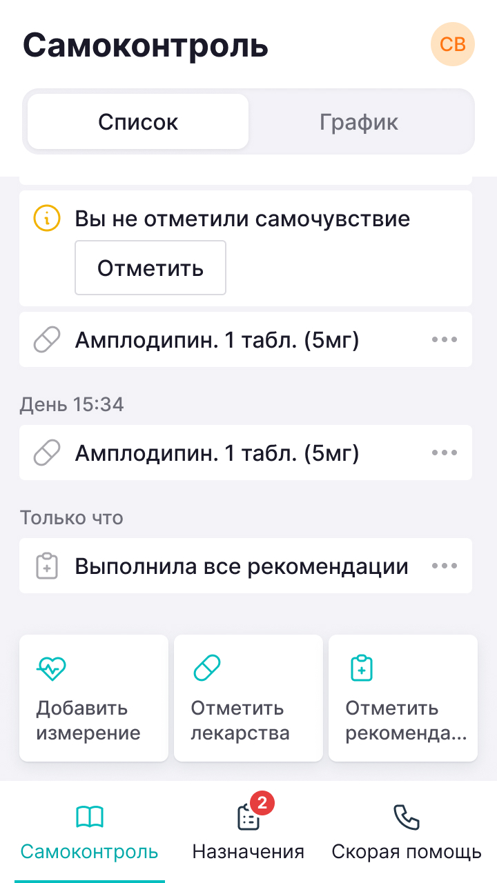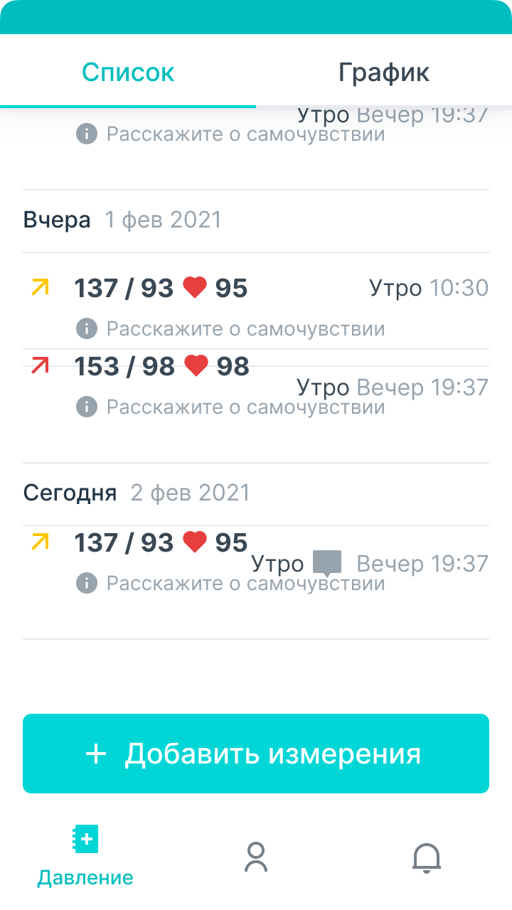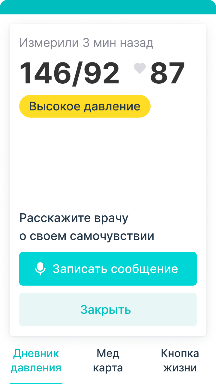 В мобильном приложении пациента кроме результатов измерения давления и пульса нужно будет отмечать самочувствие, просматривать назначения врача. А в случае необходимости — вызывать скорую помощь, нажав на «кнопку жизни».