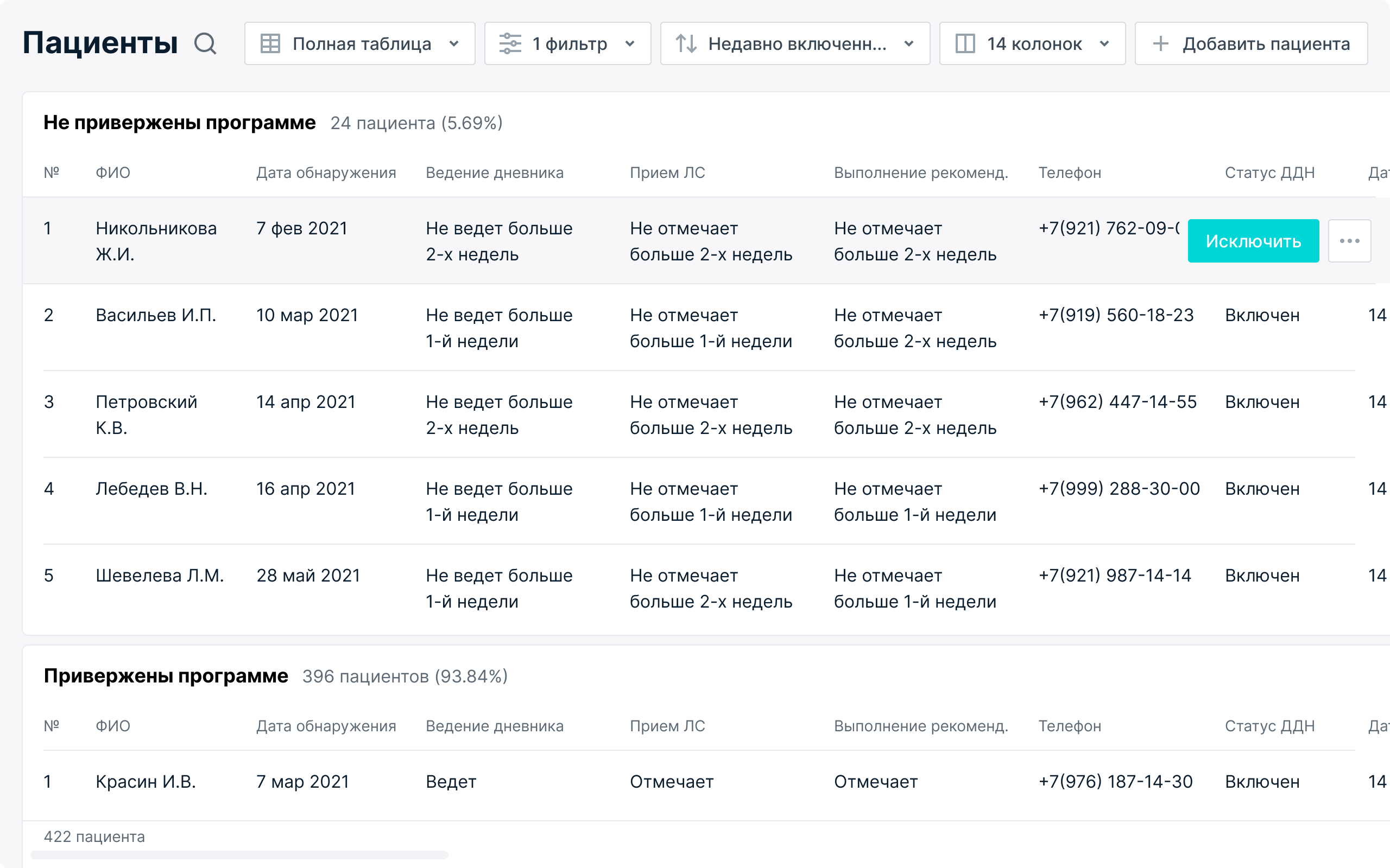 Главврачу важно видеть общую картину: результаты лечения, критические случаи за день, за неделю и т.п. К тому же все эти данные должны сохраняться для научных исследований. Сложная, перегруженная таблица получается. Но мы придумали, как ее упаковать. Разбили таблицу на пресеты — фильтры с набором настроек на конкретные ситуации. Допустим, понадобится список пациентов, не приверженных программе, — и пресет выдаст компактную таблицу с необходимой информацией для анализа и статистики.